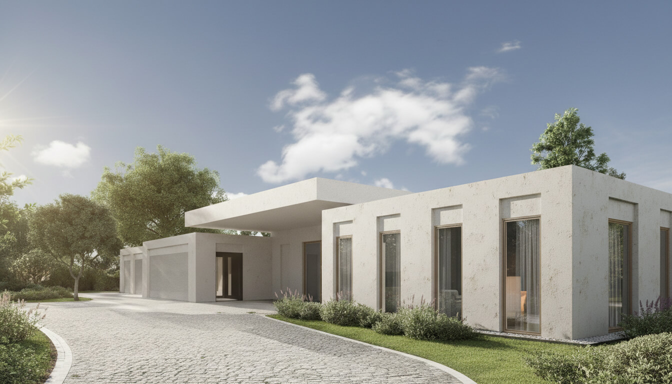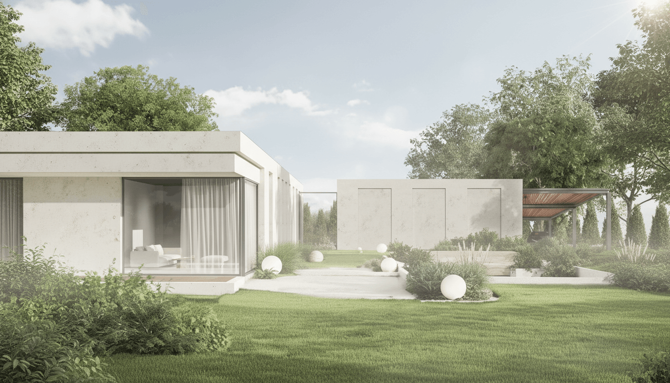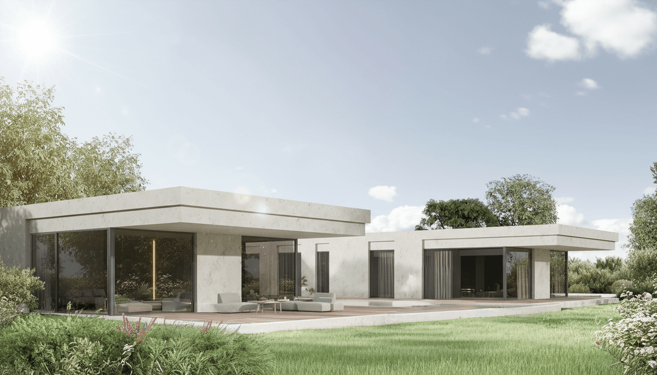 Projekt rezydencji to współczesna interpretacja modernistycznej architektury, gdzie minimalistyczna forma spotyka się z wyrafinowaną elegancją. Bryła budynku została skomponowana z połączonych kubicznych modułów o płaskich dachach, tworząc dynamiczną, horyzontalną kompozycję doskonale wpisującą się w naturalny krajobraz. Elewacja wykończona hiszpańskim wapieniem nadaje budowli szlachetny, ponadczasowy charakter, gdzie naturalna faktura kamienia subtelnie współgra z wielkopowierzchniowymi przeszkleniami.
