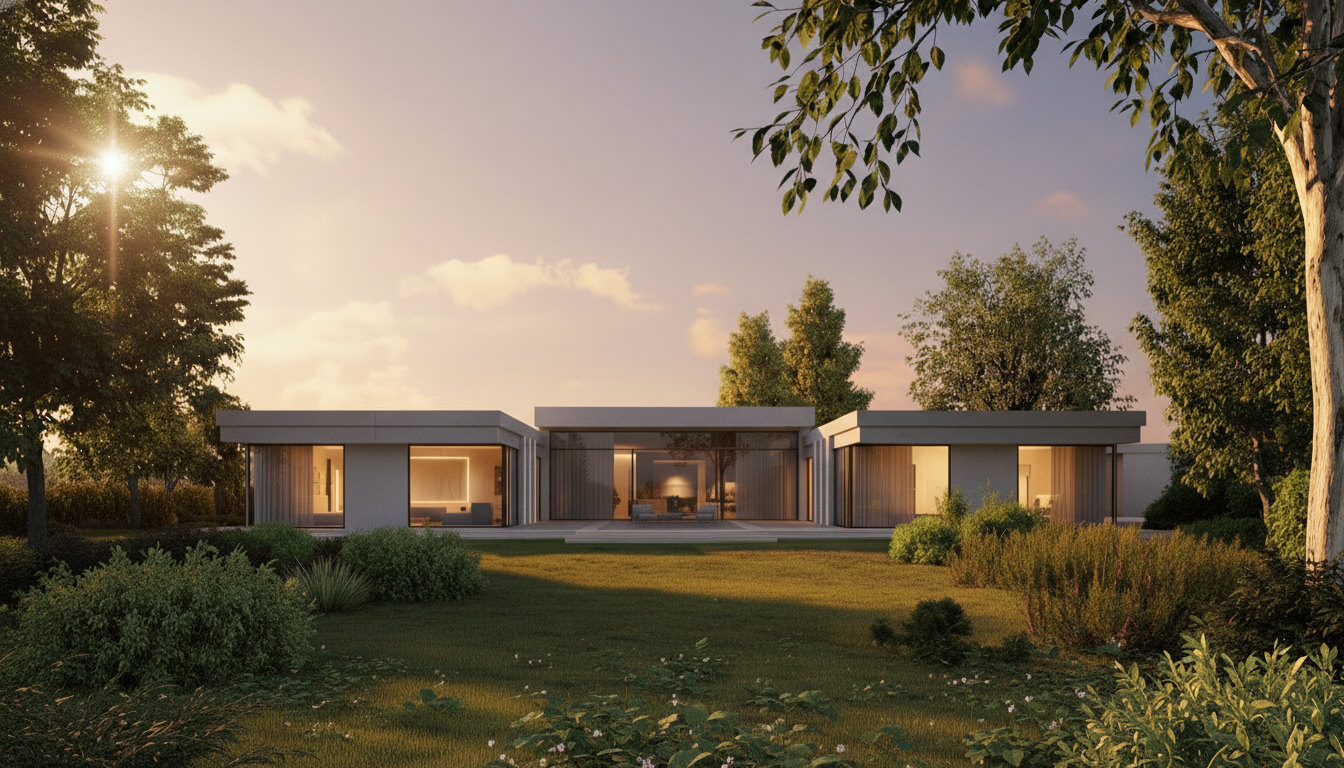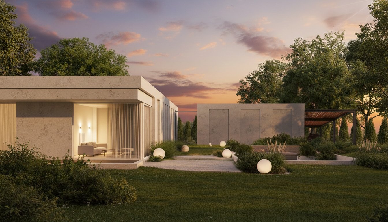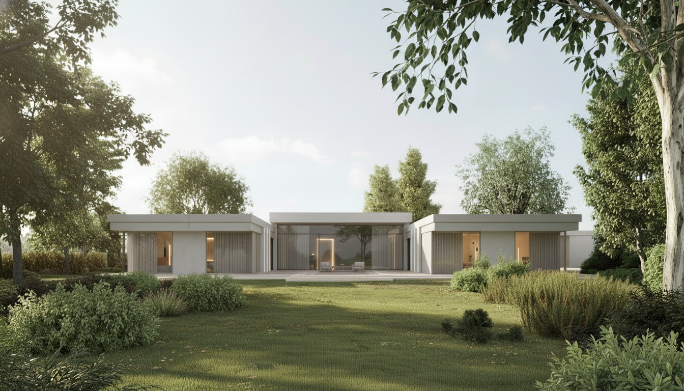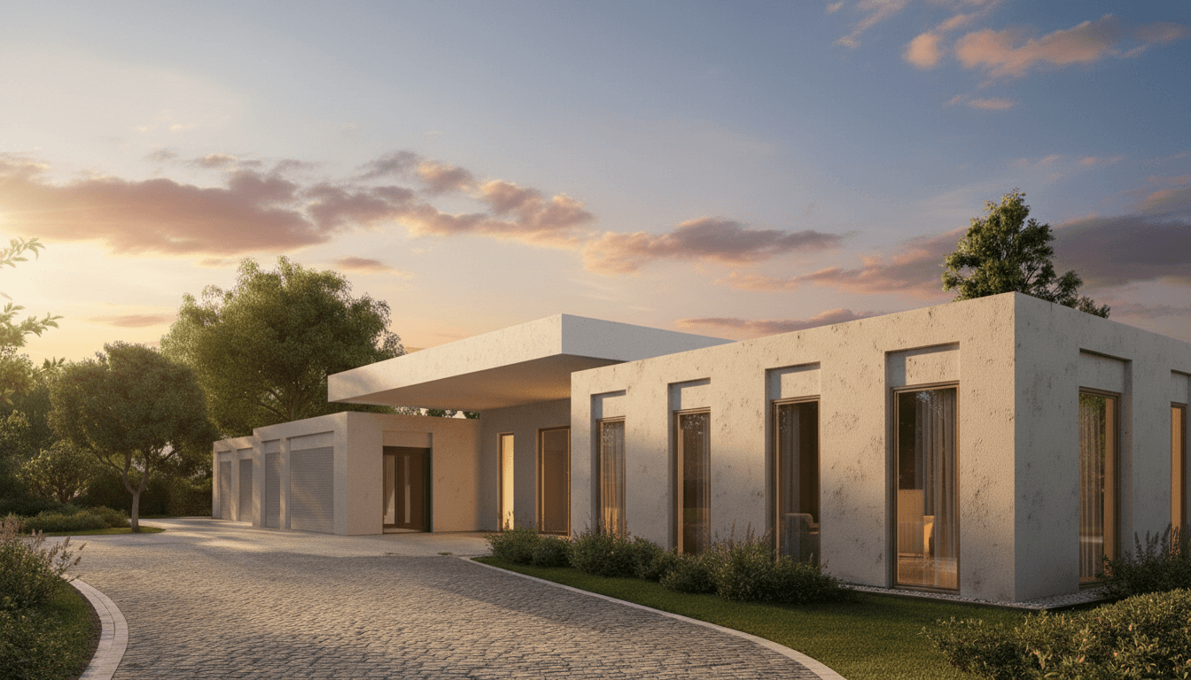 Projekt rezydencji to współczesna interpretacja modernistycznej architektury, gdzie minimalistyczna forma spotyka się z wyrafinowaną elegancją. Bryła budynku została skomponowana z połączonych kubicznych modułów o płaskich dachach, tworząc dynamiczną, horyzontalną kompozycję doskonale wpisującą się w naturalny krajobraz. Elewacja wykończona hiszpańskim wapieniem nadaje budowli szlachetny, ponadczasowy charakter, gdzie naturalna faktura kamienia subtelnie współgra z wielkopowierzchniowymi przeszkleniami.