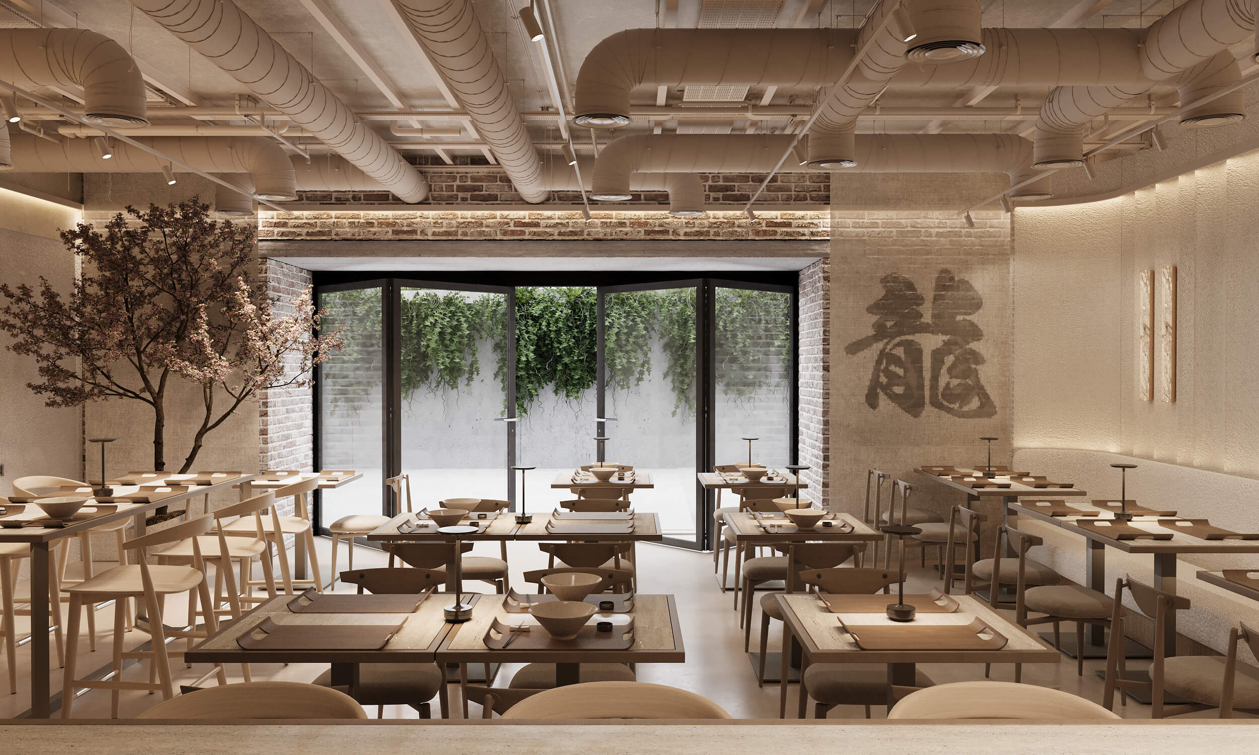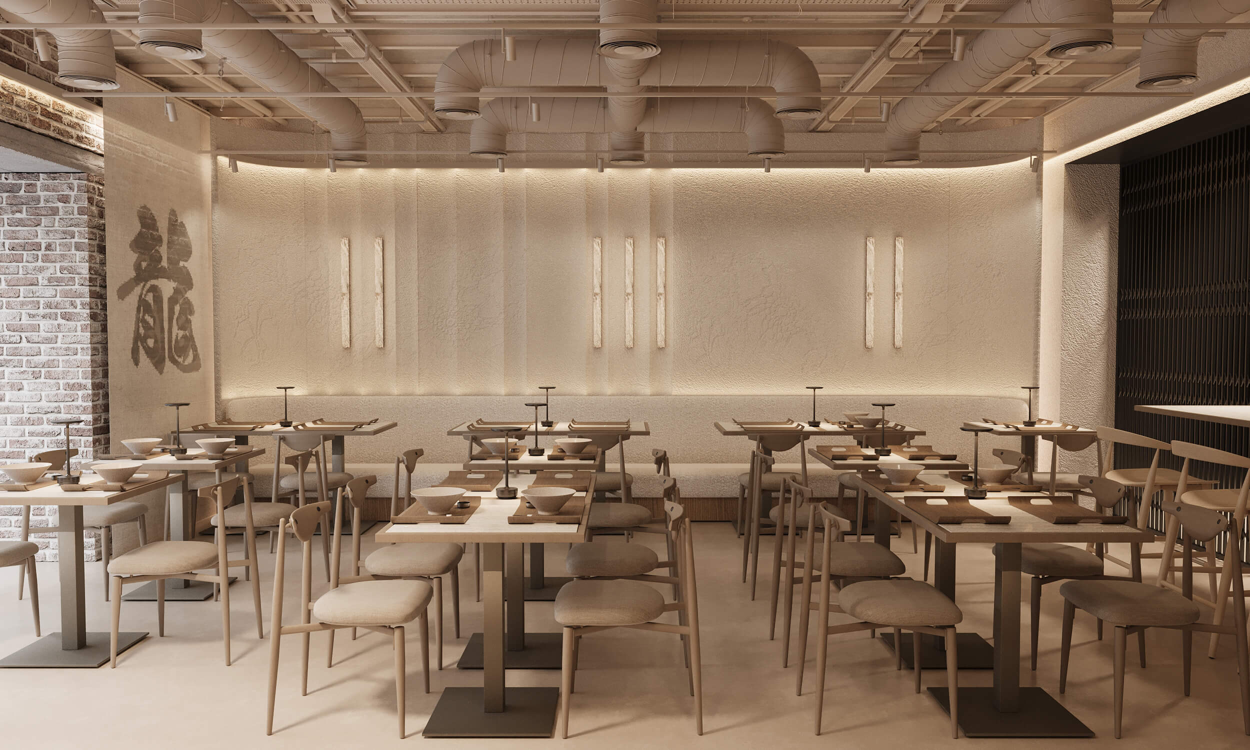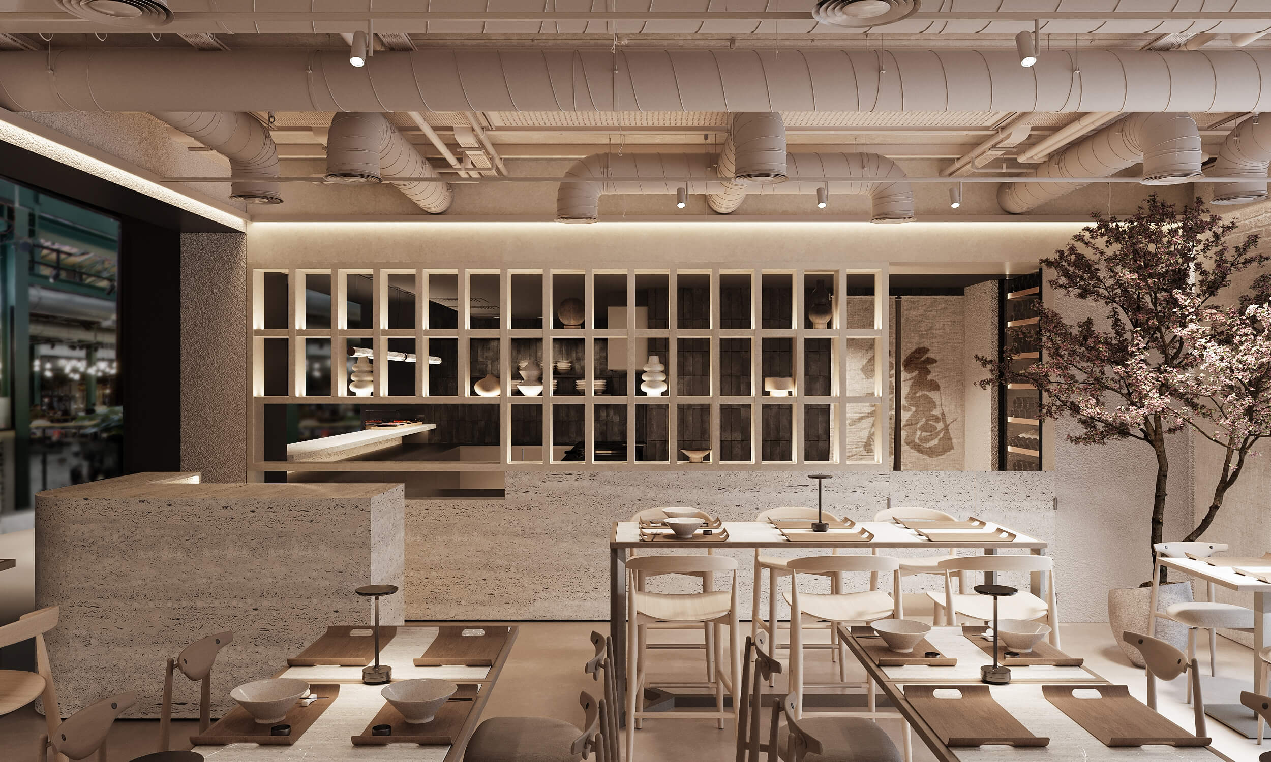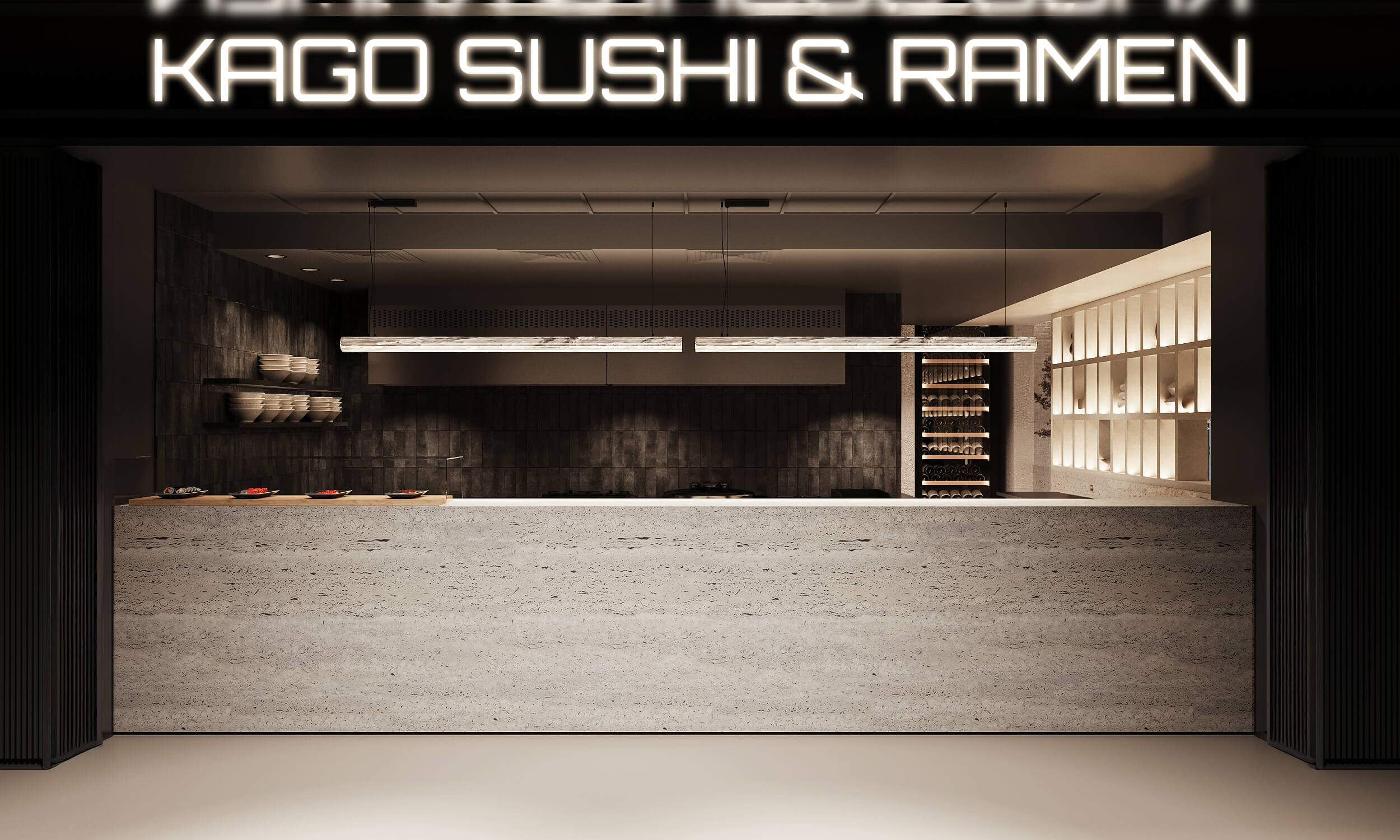 Kago Sushi & Ramen to nowoczesna przestrzeń gastronomiczna, w której minimalistyczna estetyka japońska spotyka się z industrialnym charakterem współczesnej architektury.