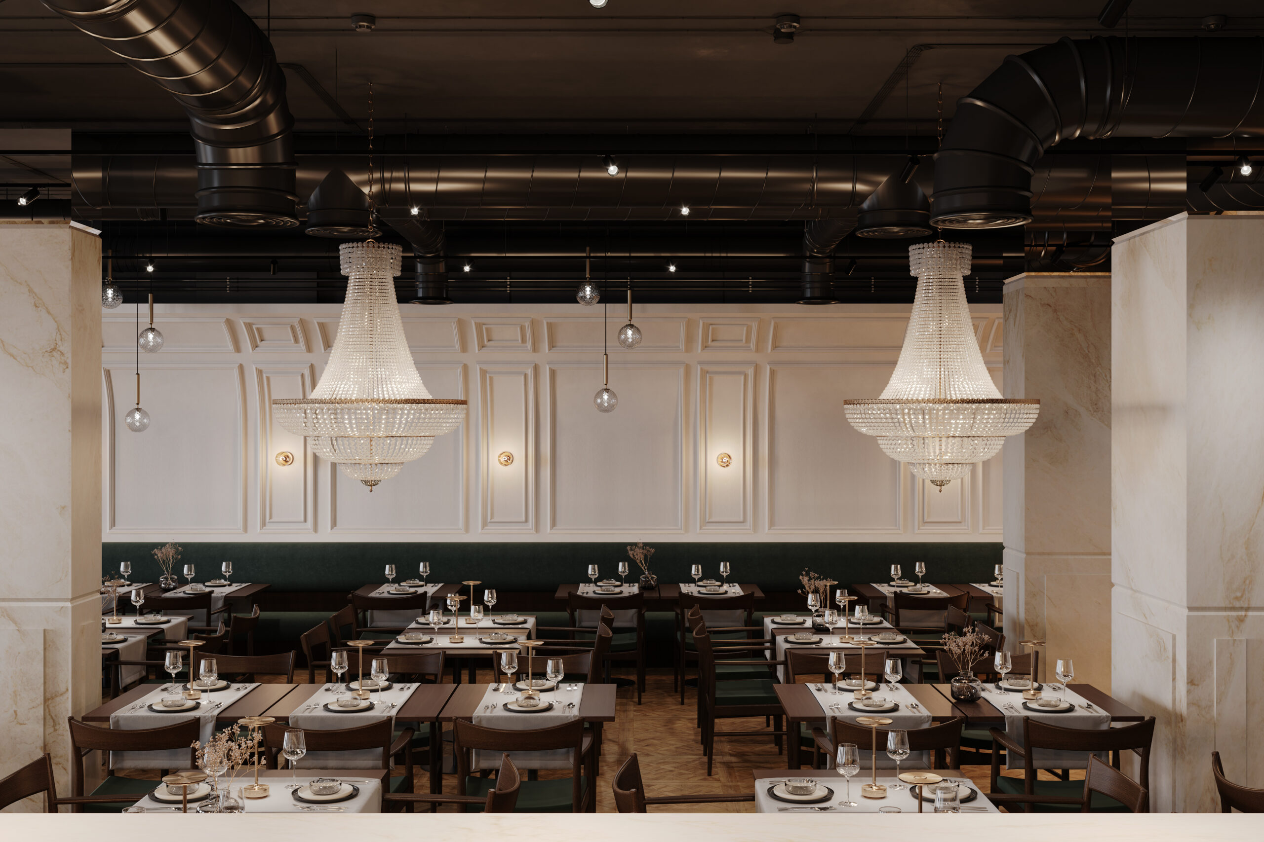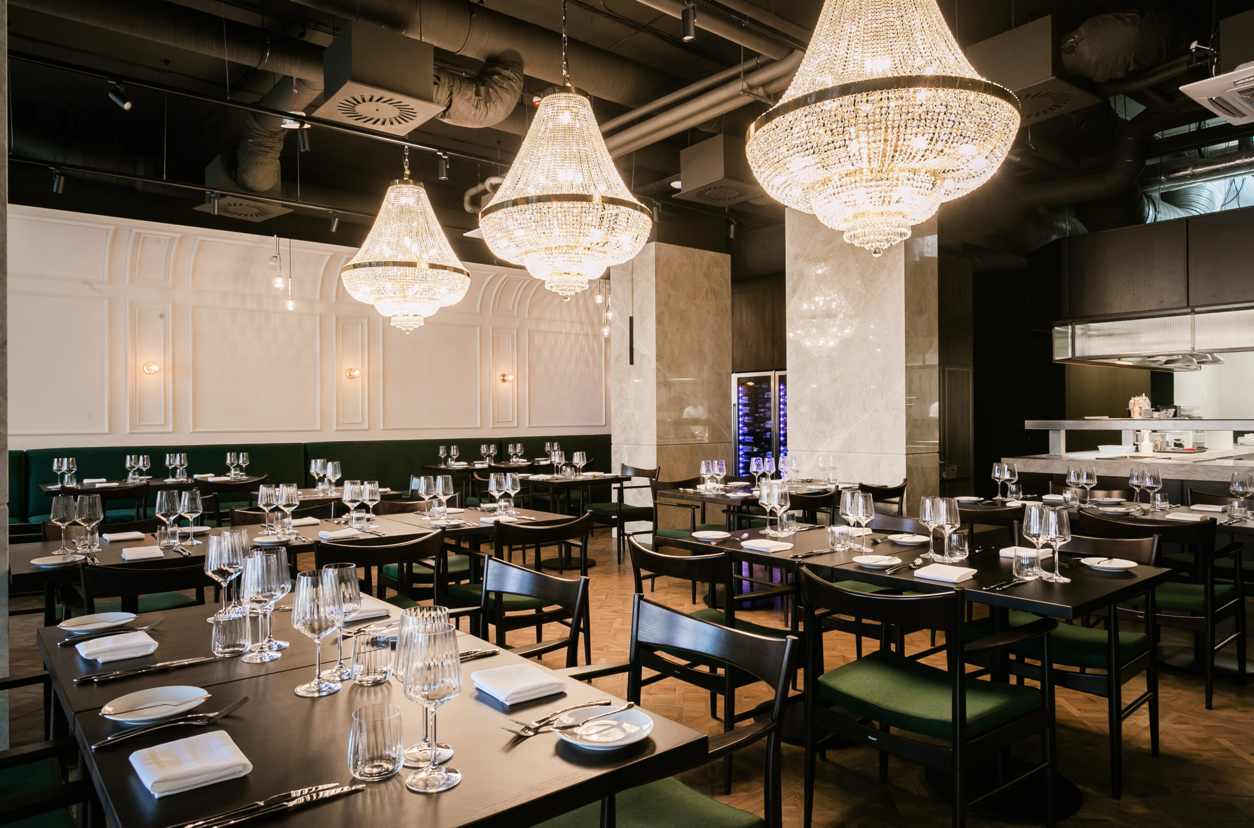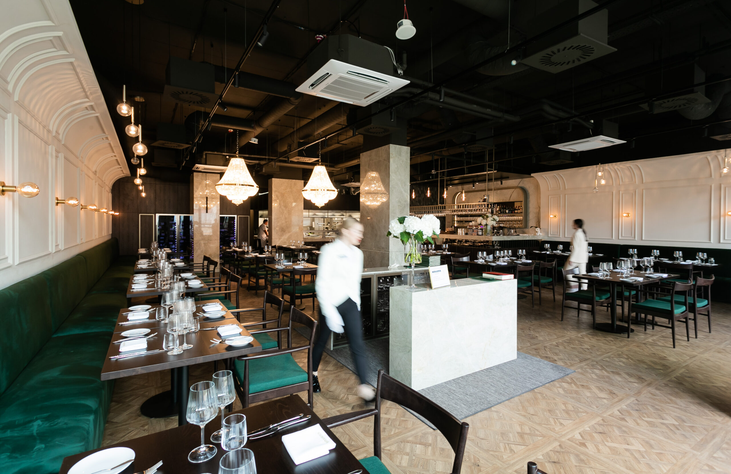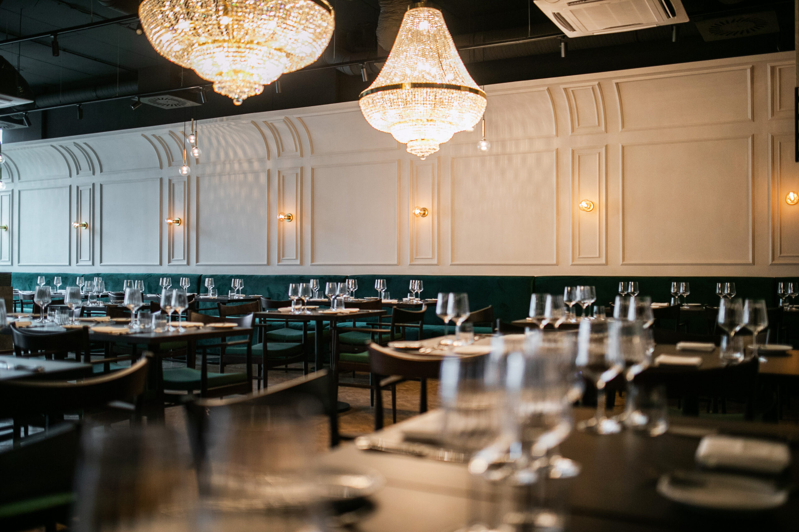 Naszym celem przy projektowaniu wnętrza restauracji Maniera w Gdańsku było połączenie klasyki i nowoczesności. Centralnym wyróżnikiem projektu są klasycystyczne żyrandole, które doskonale komponują się z ciemnozieloną tapicerką i drewnianą podłogą. Sztukateria na ścianach dodaje wnętrzu wyjątkowego charakteru i współgra stylistycznie z żyrandolami.
