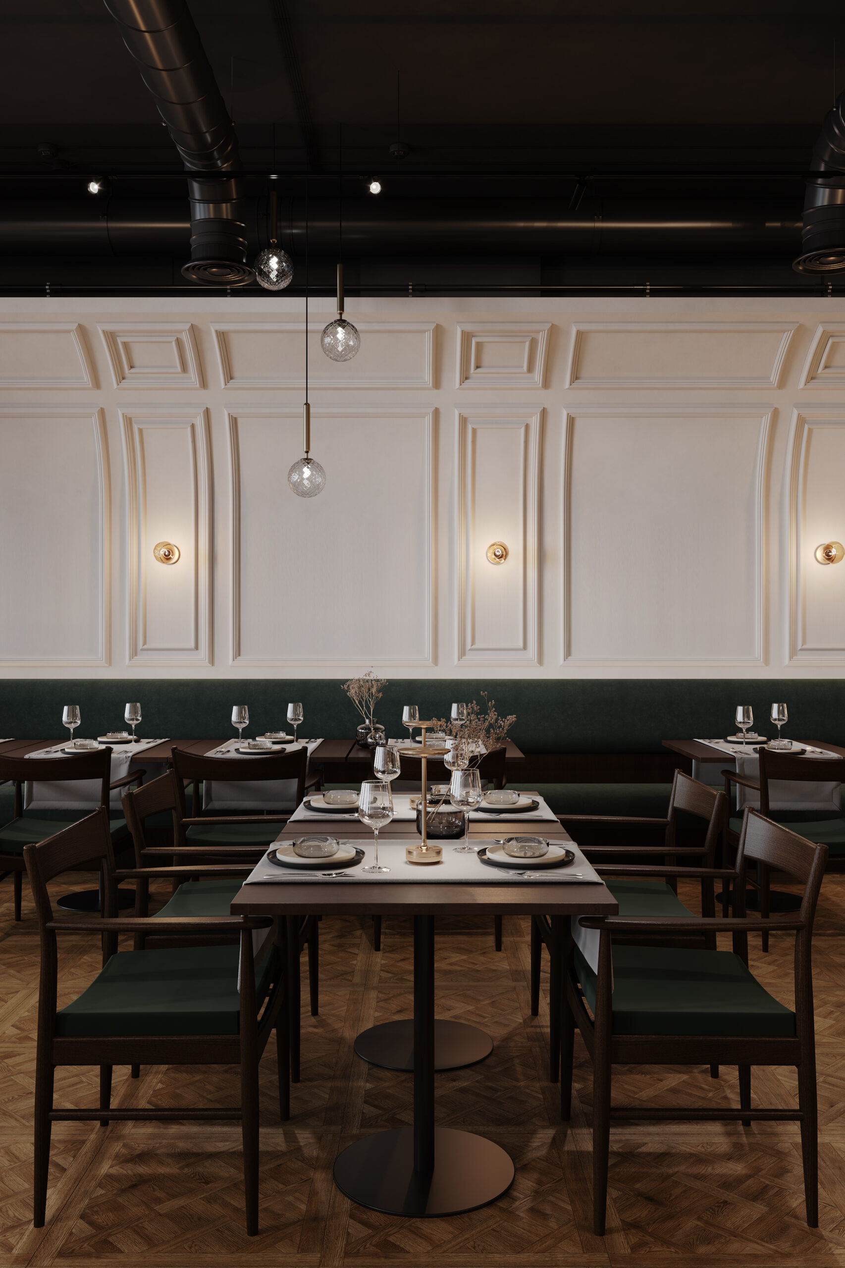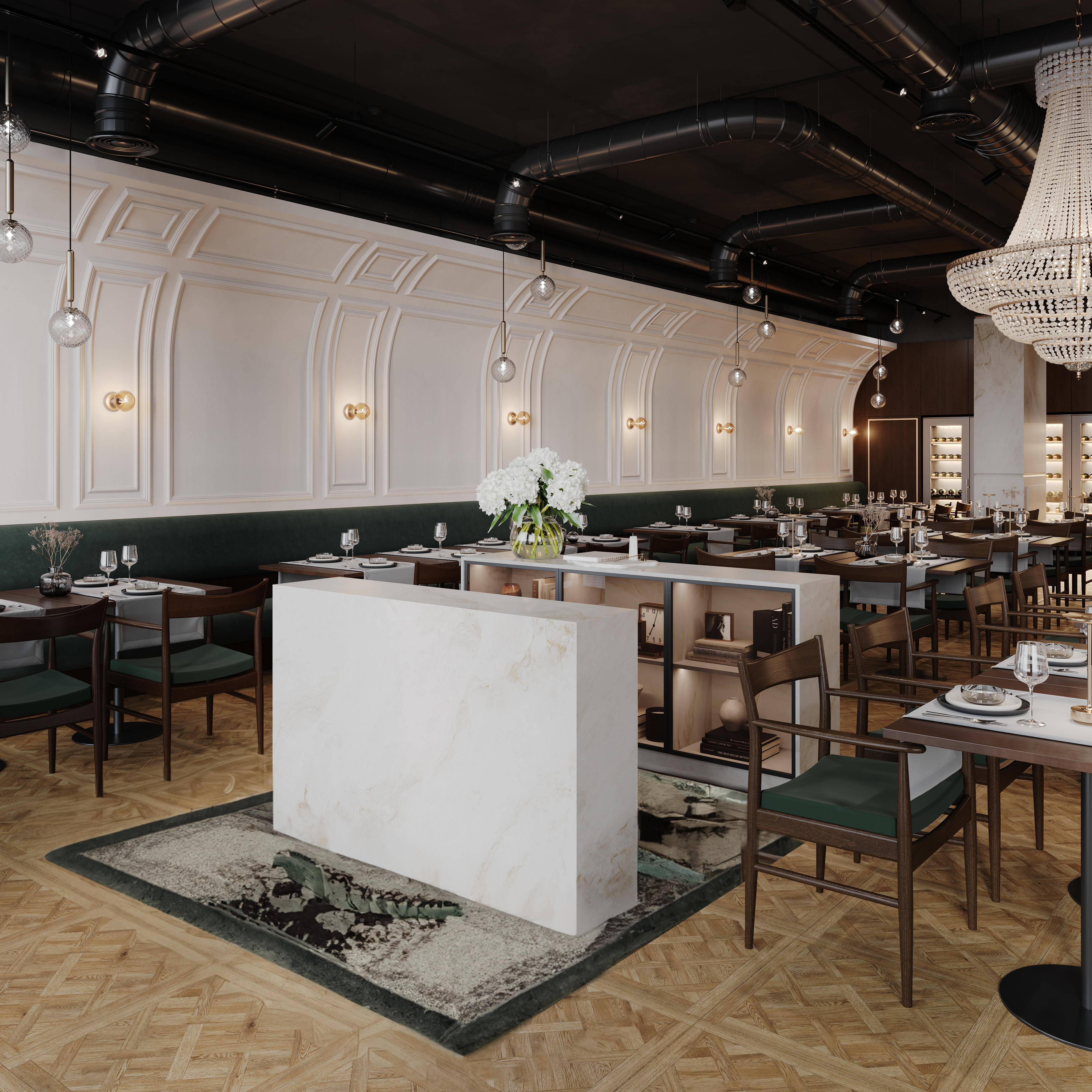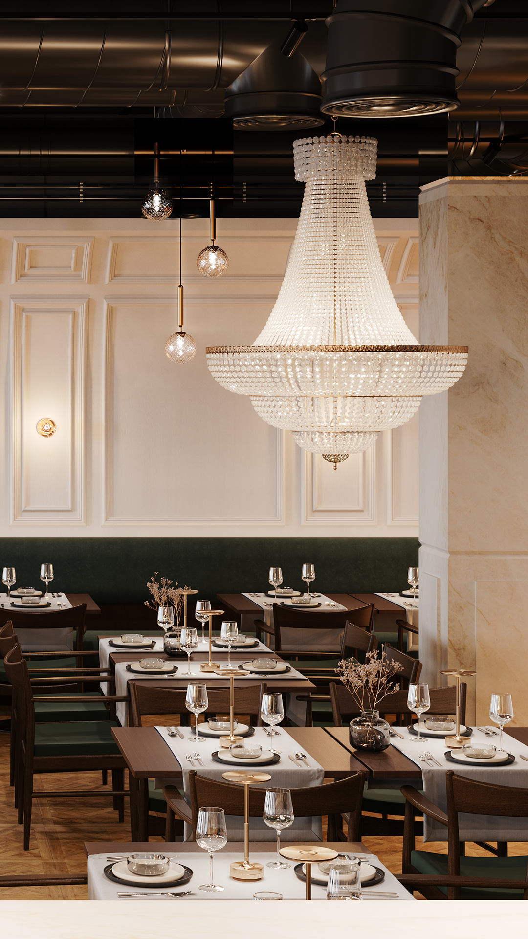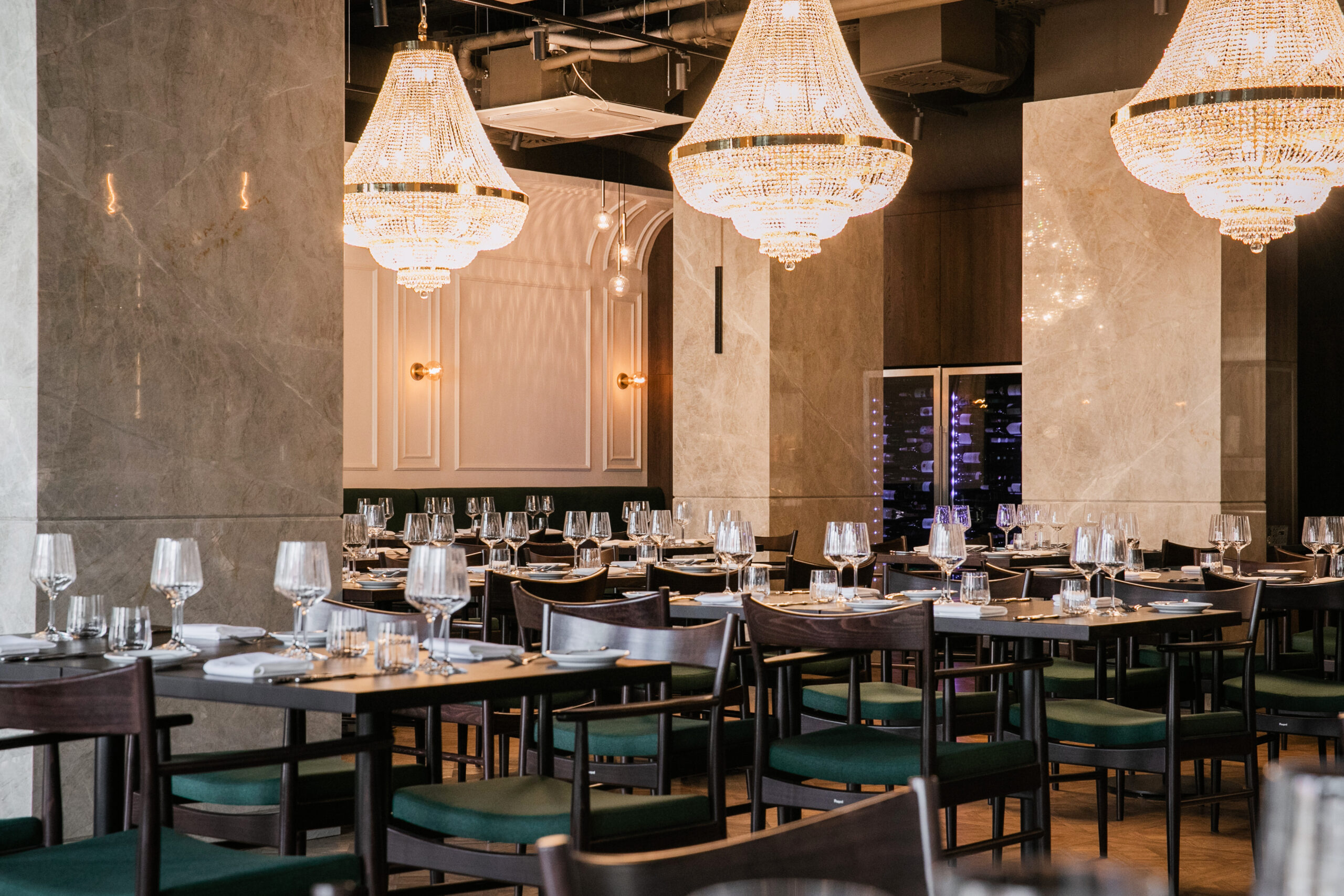 Naszym celem przy projektowaniu wnętrza restauracji Maniera w Gdańsku było połączenie klasyki i nowoczesności. Centralnym wyróżnikiem projektu są klasycystyczne żyrandole, które doskonale komponują się z ciemnozieloną tapicerką i drewnianą podłogą. Sztukateria na ścianach dodaje wnętrzu wyjątkowego charakteru i współgra stylistycznie z żyrandolami.