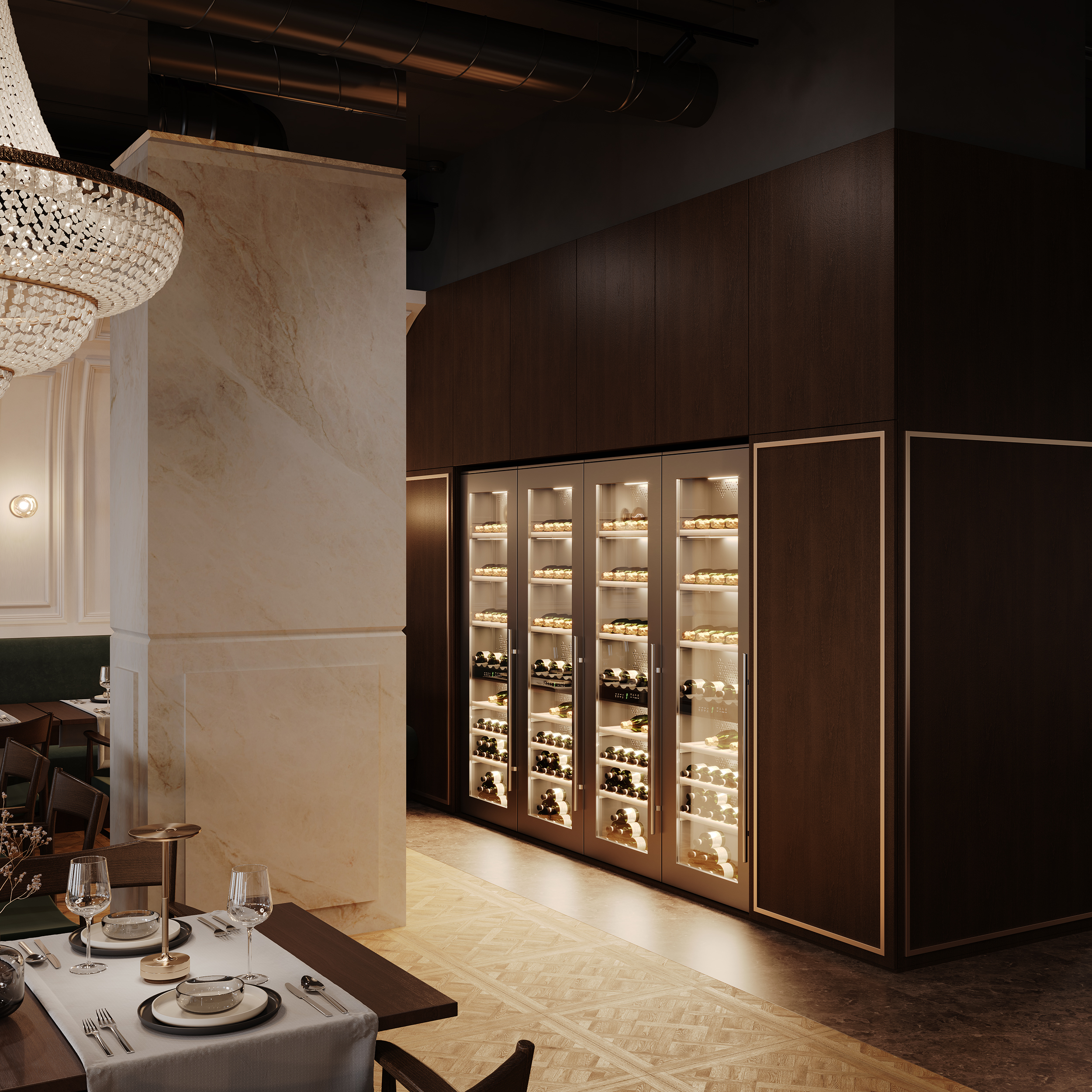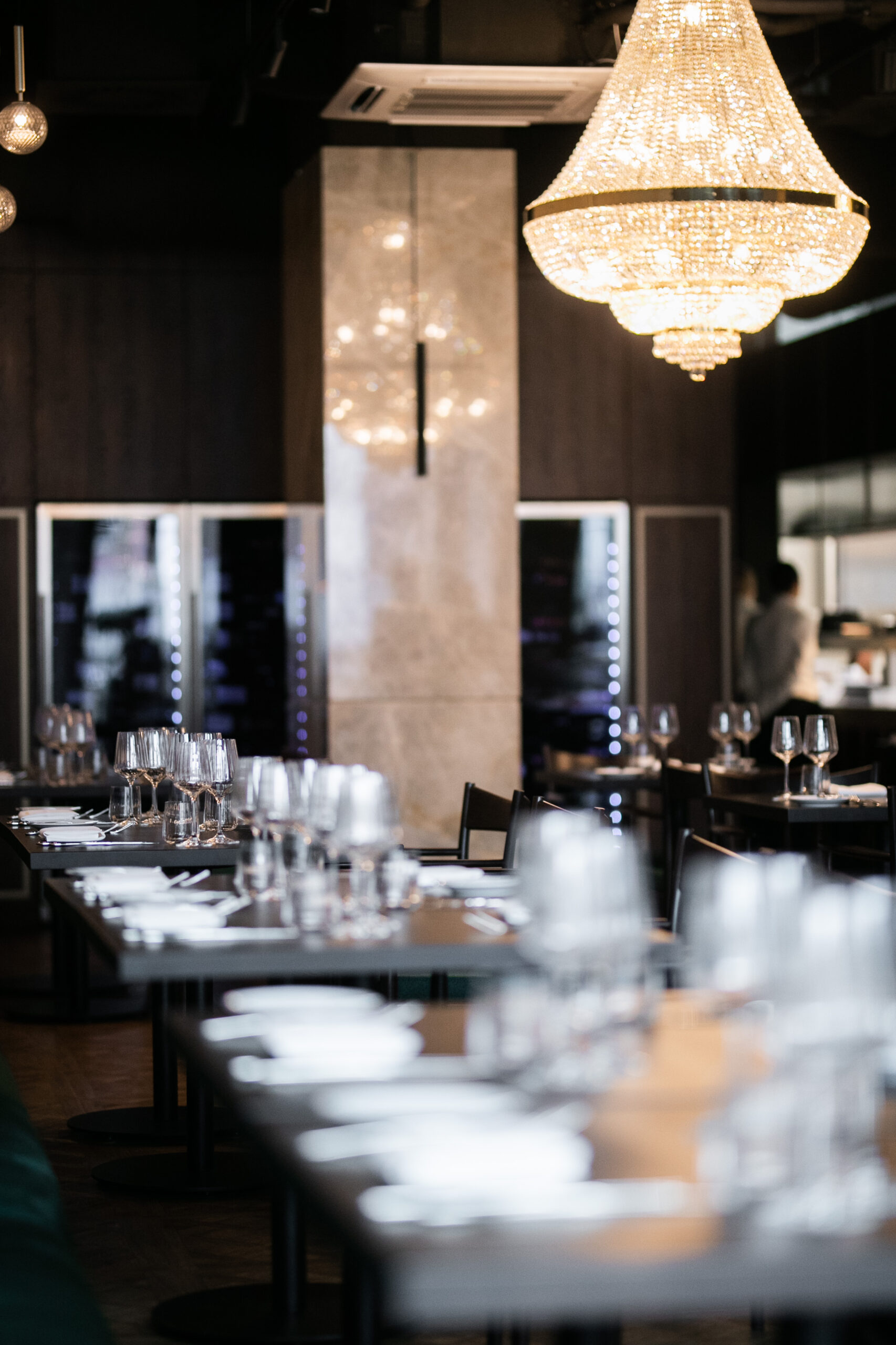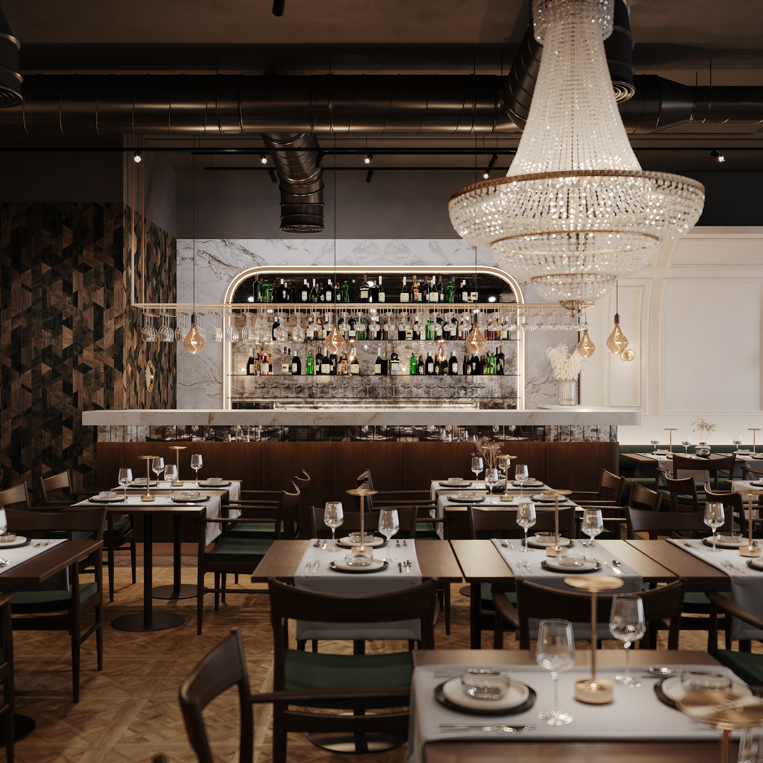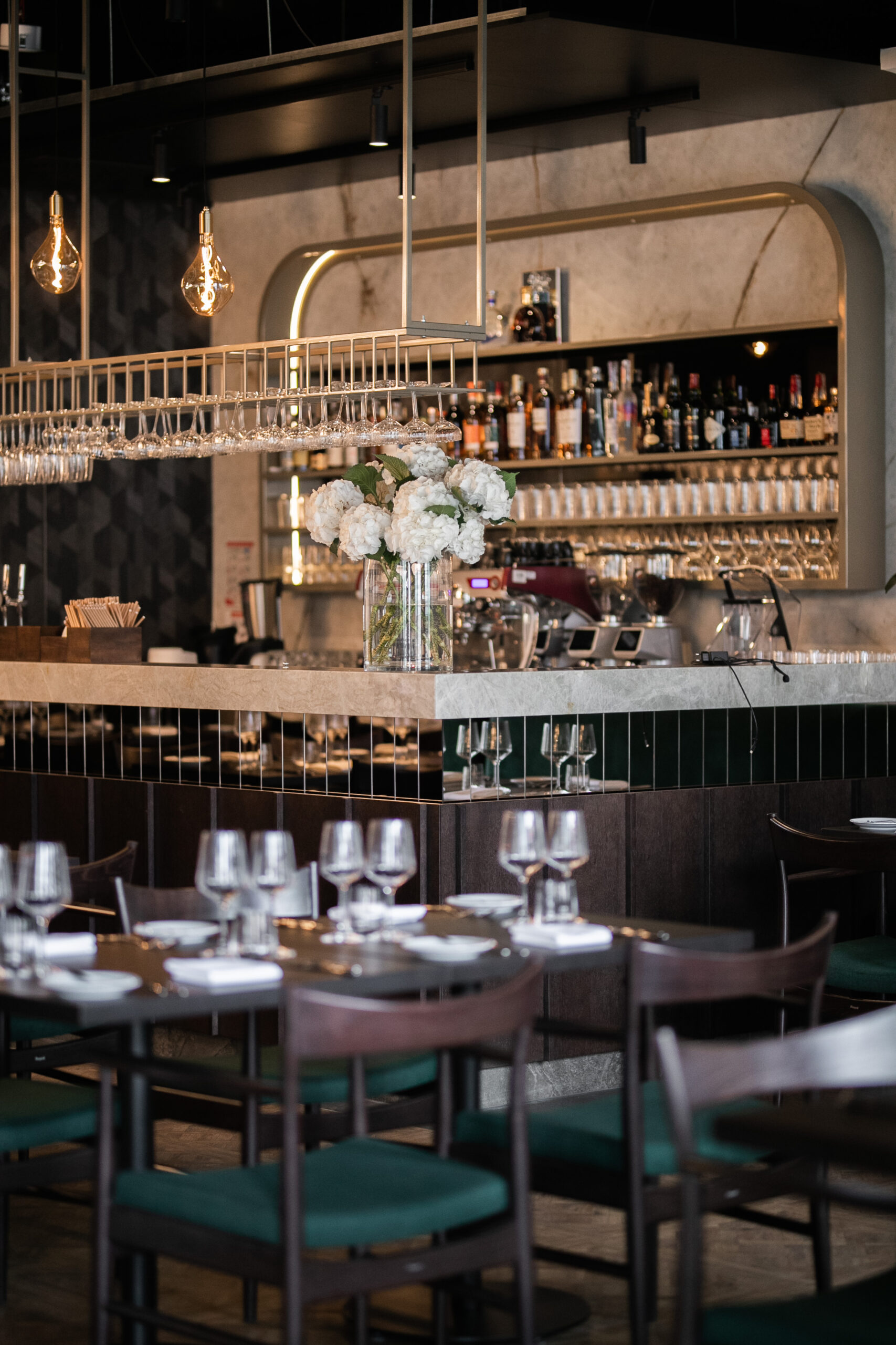 Naszym celem przy projektowaniu wnętrza restauracji Maniera w Gdańsku było połączenie klasyki i nowoczesności. Centralnym wyróżnikiem projektu są klasycystyczne żyrandole, które doskonale komponują się z ciemnozieloną tapicerką i drewnianą podłogą. Sztukateria na ścianach dodaje wnętrzu wyjątkowego charakteru i współgra stylistycznie z żyrandolami.